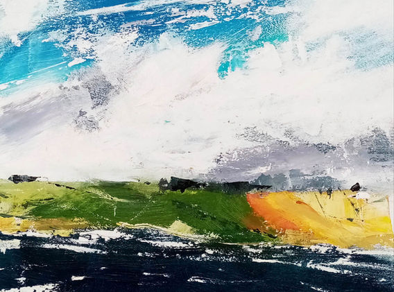 Christine has been painting in Pembrokeshire for many years. Walking the coast paths, in awe at the unfolding of the landscape; its strange, ancient quality, achingly beautiful, raw and powerful. It’s the essence and the dynamic of this landscape that it is always her intention to represent. Light travelling over land, highlighting the colours of mineral-streaked rocks, transforming the sea from darkness to brilliance, moment to moment. She makes sketches or paintings for reference always using colour because, for her, it’s the colours that need to be authentic. However much the finished result moves toward abstraction, it’s the colours that ground a painting, connecting it to the landscape.